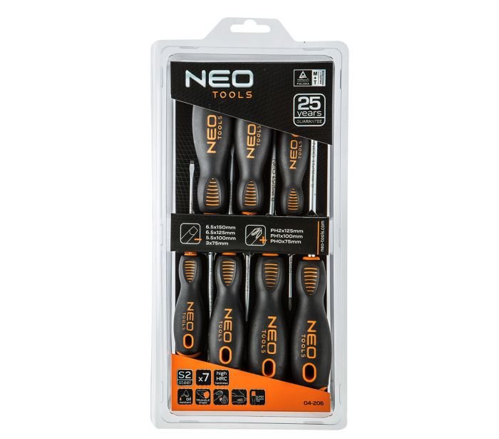 Set odvijača NEO TOOLS 04-206 sadrži 7 odvijača: ravnih i krstastih. Osovina odvijača izrađen je od izuzetno izdržljivog S2 čelika. Oštrica odvijača je termički obrađena da bi se dobila odgovarajuća tvrdoća i otpornost na savijanje. Odvijač ima magnetni vrh. Trouglasti oblik ručke sa profilisanim osloncem za palac smanjuje napor ruku tokom rada i olakšava postizanje pravog obrtnog momenta. Ručka napravljena od dva materijala. Sprečava klizanje u ruci, takođe, otporna je na hemikalije, ulja i masti. Kvalitet alata potvrđen je TUV sertifikatom i 25 godina garancije proizvođača. Brend NEO ispunjava očekivanja profesionalaca.